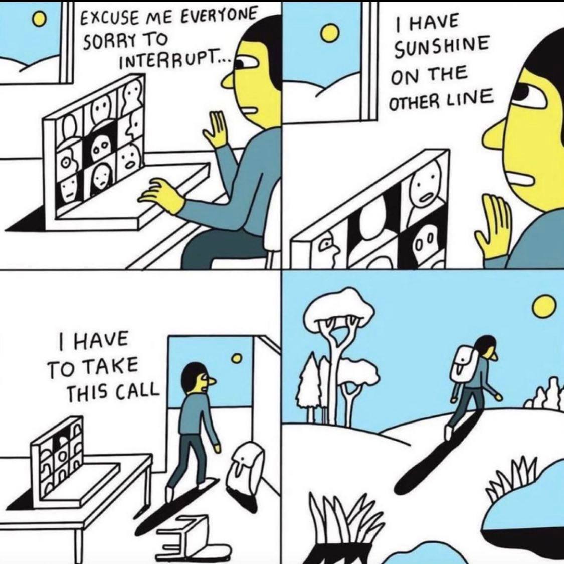 11:44 am: I was reading this comic where the man says, "I have sunshine ☀️ on the other line. I have to take this call." and walks out on a hike. I went downstairs to take a break and noticed it was 25C, so I took a walk 🚶 in the dog park. It's a good place to meet all kinds of nice people and their dogs.